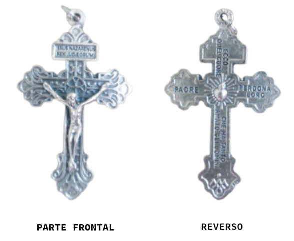 En su reverso, en el transverso de los brazos, aparece la frase: “PADRE PERDONA LORO” (“Padre perdónalos”) , y en la vertical se lee la inscripción: “ECCO QUEL CUORE CHE HA TANTO AMATO GLI UOMINI” ( “He aquí este corazón que tanto ha amado a los hombres”).