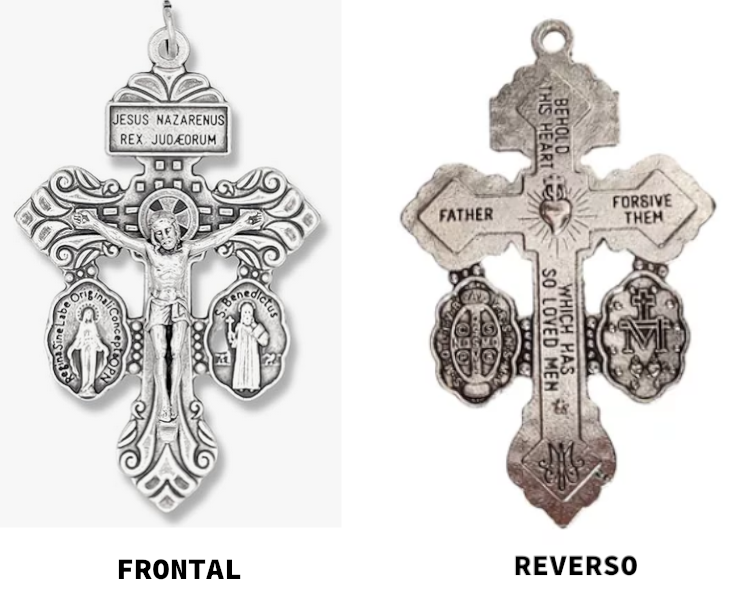 En su parte frontal, sobre la imagen de Nuestro Señor Jesucristo, aparece la inscripción “Iesus Nazarenus Rex Iudaeorum” o su fórmula abreviada “I.N.R.I.”, que traducida del latín significa: Jesús Nazareno Rey de los Judíos.